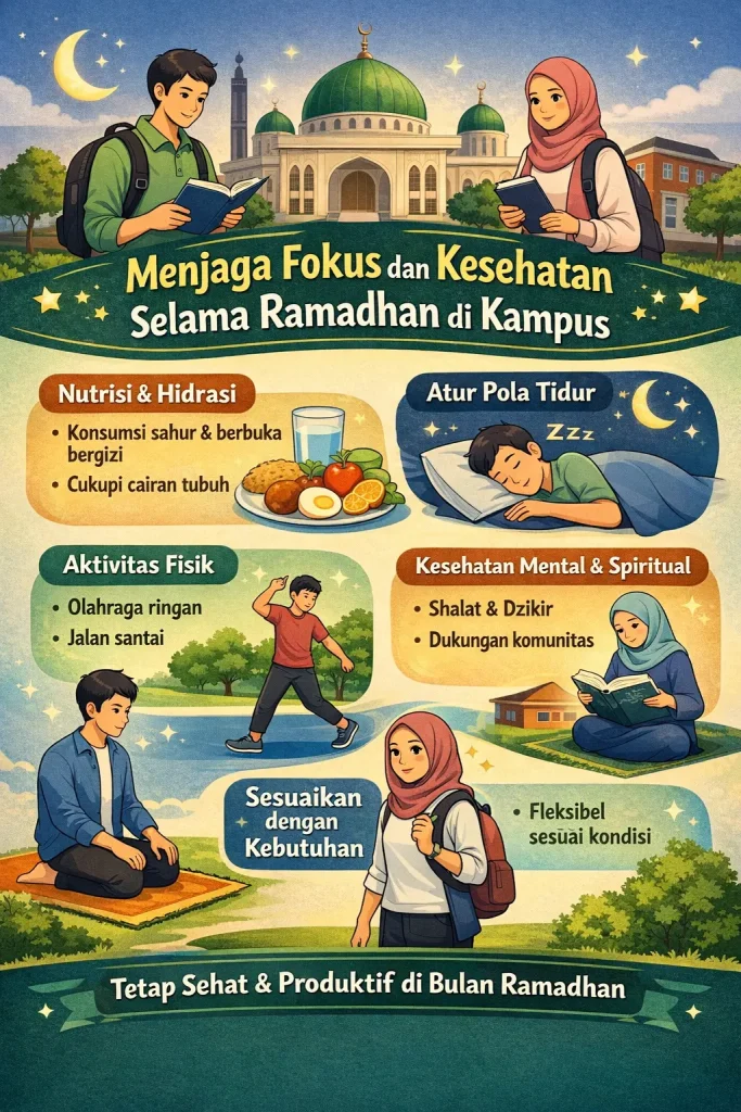 Bulan Ramadhan merupakan waktu yang penuh makna bagi umat Muslim untuk meningkatkan kualitas ibadah dan pengendalian diri. Namun bagi mahasiswa dan civitas akademika di kampus, menjalani ibadah puasa sambil tetap mengikuti kegiatan akademik dapat menjadi tantangan tersendiri. Perubahan pola makan, tidur, dan aktivitas dapat memengaruhi tingkat energi, konsentrasi, serta kesehatan secara keseluruhan.